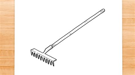 Retro cartoon style drawing of a hand rake , a garden or gardening tool equipment on isolated white background done in black and white. Draw a horizontal line above the rake guides for the return profiles storyboard. A man in a yard hold.